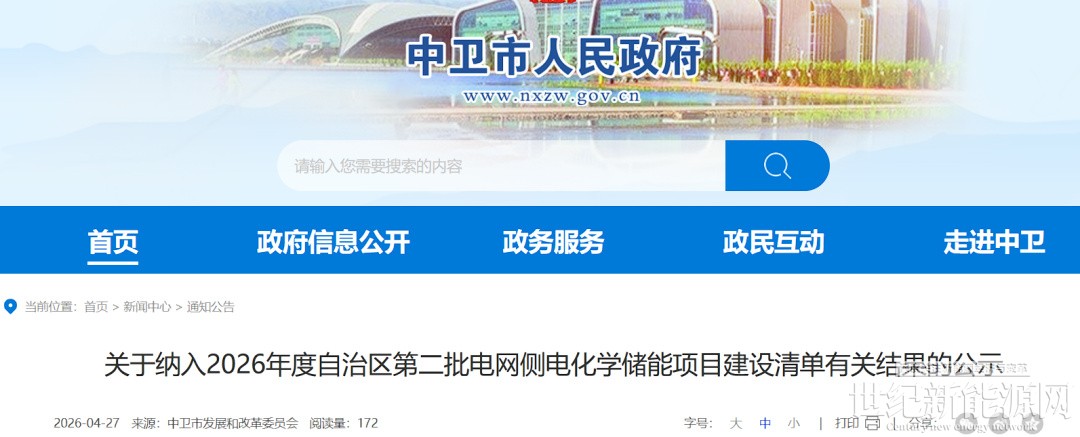 4月27日,中卫市发展和改革委员会发布《 关于纳入2026年度自治区第二批电网侧电化学储能项目建设清单有关结果的公示》,本次纳入2026年度自治区第二批电网侧电化学储能项目建设清单项目共7个,总规模1200MW/4000MWh,总投资39.36亿元,计划于2026年9月30日并网。