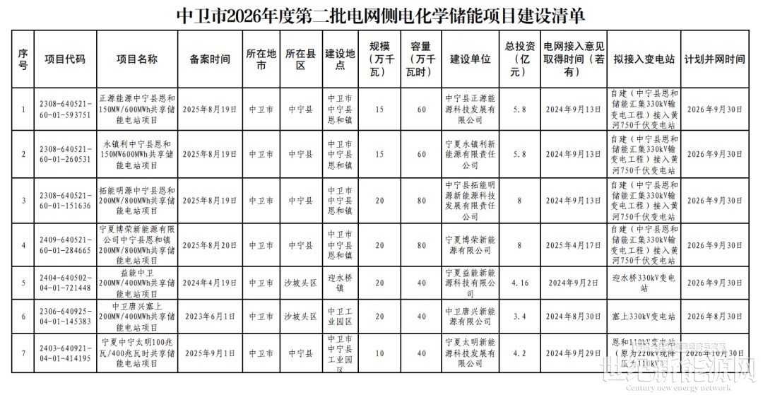 近日,宁夏多地公布2026年度第二批电网侧电化学储能项目建设清单。