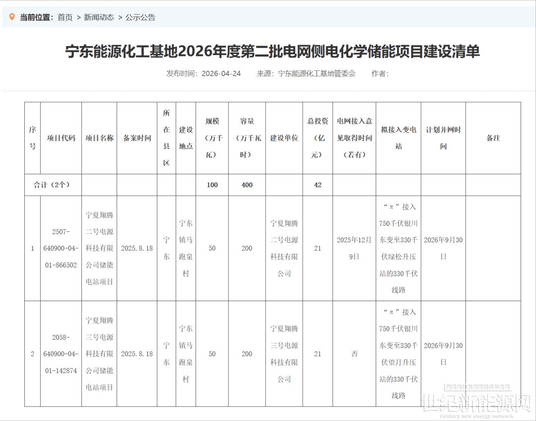 4月24日,宁东能源化工基地2026年度第二批电网侧电化学储能项目建设清单公布,共2个项目入选,每个规模均为500MW/2000MWh,总规模为1000MW/4000MWh。