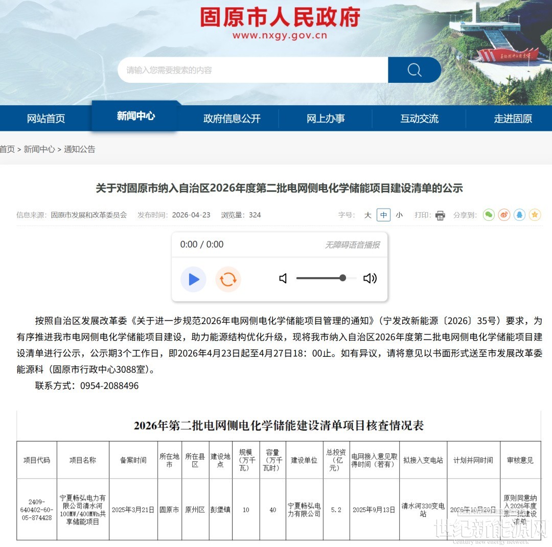 4月23日,固原市发展和改革委员会发布《关于对固原市纳入自治区2026年度第二批电网侧电化学储能项目建设清单的公示》,1个项目入选,规模为100MW/400MWh。
