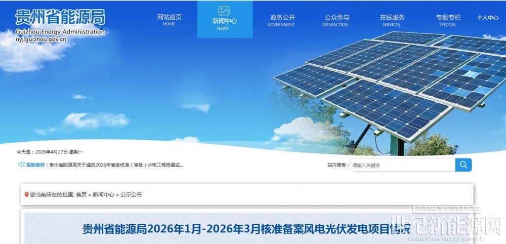 4月27日,贵州省能源局公布2026年1月-2026年3月核准备案风电光伏发电项目情况。