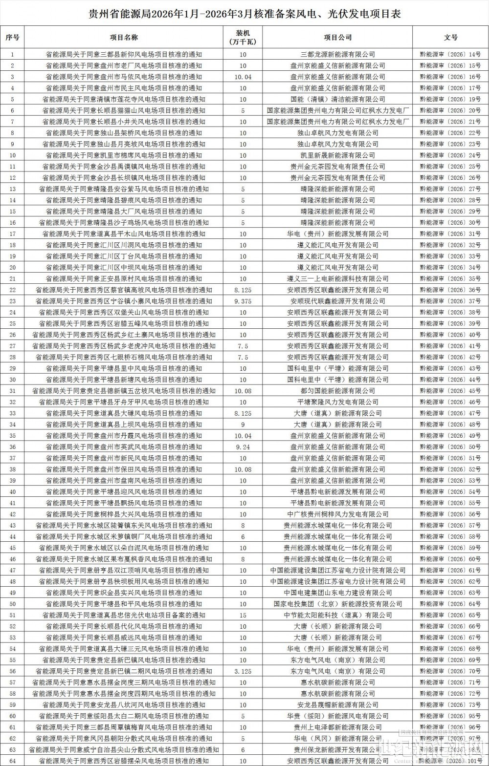 根据《省人民政府关于印发贵州省企业投资项目核准和备案管理办法的通知》(黔府发〔2018〕第7号),按照程序,贵州省能源局2026年1月-2026年3月核准备案风电、光伏发电项目64个,现将有关情况公布如下。