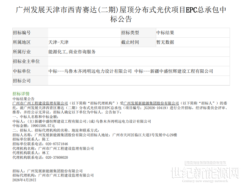 4月28日,广州发展天津市西青赛达(二期)屋顶分布式光伏项目EPC总承包中标公告。