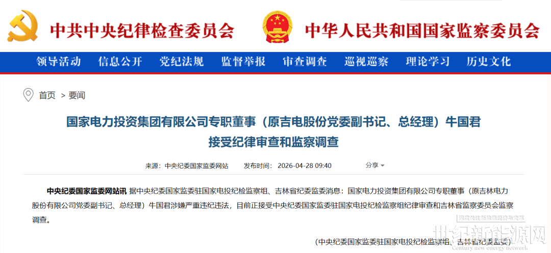 中央纪委国家监委网站4月28日消息,据中央纪委国家监委驻国家电投纪检监察组、吉林省纪委监委消息:国家电力投资集团有限公司专职董事(原吉林电力股份有限公司党委副书记、总经理)牛国君涉嫌严重违纪违法,目前正接受中央纪委国家监委驻国家电投纪检监察组纪律审查和吉林省监察委员会监察调查。