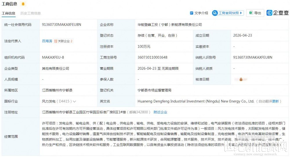 企查查网站显示,近日,华能登峰工投(宁都)新能源有限责任公司成立,法定代表人为吕海涛,注册资本100万元。