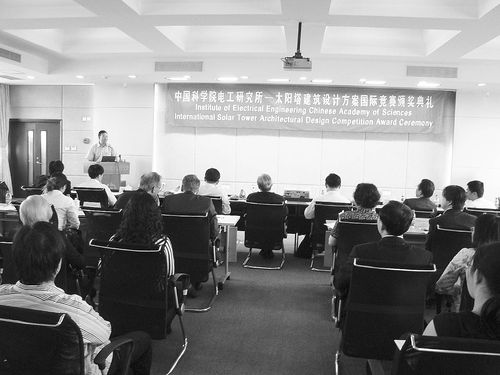 5月8日,“中科院电工所――太阳塔建筑设计方案国际竞赛颁奖典礼”在中国科学院电工研究所主楼报告厅举行。中国工程热物理学会徐建中院士、科技部高新司武平处长、科技部“863”领域专家组姚强教授、中国资源综合利用协会可再生能源专业委员会朱俊生主任、北京市科委滕树龙处长、北京延庆县政府投资促进局刘晓光局长,中科院电工所的领导和师生以及此次竞赛的参赛单位和参赛者参加了颁奖典礼。