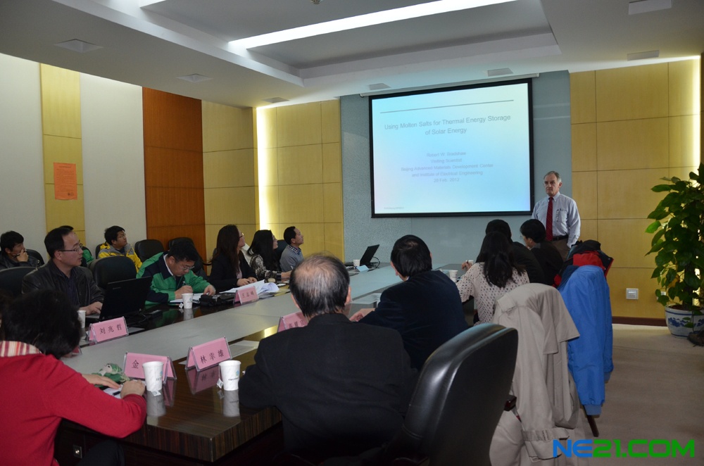 2月28日,熔融盐储能及光热发电技术交流会在电工所1号楼703会议室召开。此次会议是第九届“中美工程技术研讨会”“太阳能热发电领域跟踪与电站系统设计研究”项目第一次技术交流会。参加此次会议的领导专家有“中美工程技术研讨会”外方专家组长林幸雄博士、Robert Bradshaw博士、高耀京博士、北京市外专局金红处长、北京市科委双新处潘红艳调研员以及来自北京市科委国际合作处和北京市新材料发展中心的领导,我实验室主任王志峰研究员、徐二树研究员、李鑫博士、徐超博士、白凤武博士及实验室相关专业技术人员也一起出席了会议。