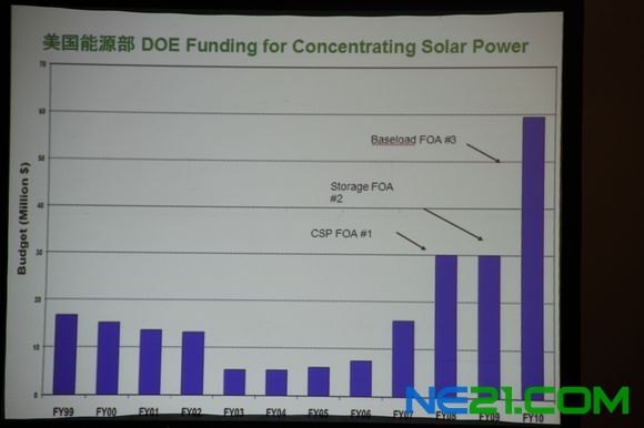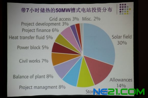 下面我给大家讲光热发电的经济性,这也是我们在座的做投资的朋友比较感兴趣的。这是一个典型的带储热50兆瓦槽式电站的分布,我们可以看到最大的一块,单块来讲最大的一块就是跟聚光相关的,这个比较容易理解,因为后面常规的部分就是也没有什么特别的需要关注的东西。这是光热发电将来成本下降的一个预测,几个不同的机构做的预测,一个是国际能源署,第二个是欧洲太阳能发电协会,第三是美国能源部。从预计上来讲美国能源部最乐观,他预测2015年的时候基本上能够到7—10美分,我个人感觉如果我们没有做大量的中国企业的参与这个目标是无法完成的,只有我们大量的中国企业的参与跟他配合才能实现这个战略目标。