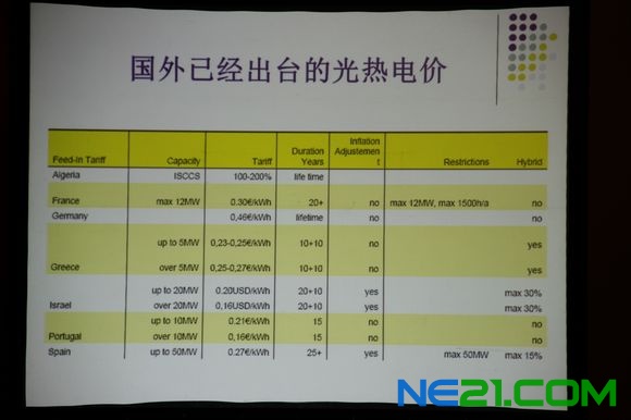 这是国外一些国家已经出台的光热发电的补贴电价政策,我们可以看到他们一般都比较明确,比如说十年、二十年怎样的一个价格,可能是浮动的也可能是固定的,相对来讲在这个价格下企业做还是有盈利的空间,因为对光热发电的成本和电价我也做过很多详细的计算。