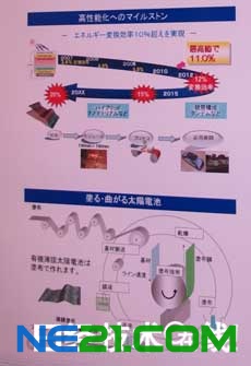 | 三菱化学在高分子学会上设置的展板,说明转换效率达到了11.0% | 在试验工厂采用R2R方式制造的有机薄膜太阳能电池 |