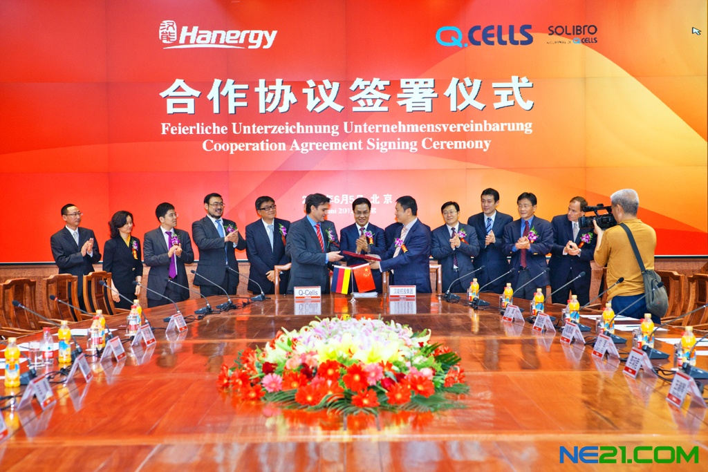 2012年6月5日,汉能与德国Q-Cells就收购Solibro一事签定合作协议。此次国际合作将使德国最先进的薄膜太阳能技术及管理优势与中国在制造业的优势结合,将有助于薄膜太阳能电池进一步进入主流市场,提振因欧债危机影响陷入低谷的全球光伏产业的信心。