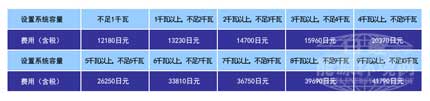 | “15年全保”费用表。将在设置电池板时一并支付。设置系统容量是一次所设置电池板的额定最大输出功率总和。(资料:夏普) |