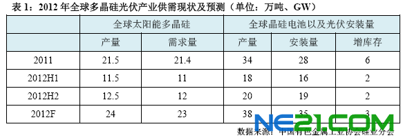 2012年上半年的全球光伏市场需求强劲,并为光伏产品出货量的提高奠定了良好基础。硅业分会估计,上半年全球晶硅电池的产量达到18GW,同比增加30%以上;其中中国国内太阳能电池片的产量达到13GW,占全球总产量的72%左右。同时,全球上半年太阳能多晶硅产量也创纪录达到11.5万吨,不仅同比增加20%以上,环比也增加10%左右。而正是多晶硅供应充足,加之市场价格过低,截止上半年底,多晶硅库存出现一定的增加。初步统计,国内外库存量增加5000吨左右,仅国内库存就增加3000-4000吨左右。