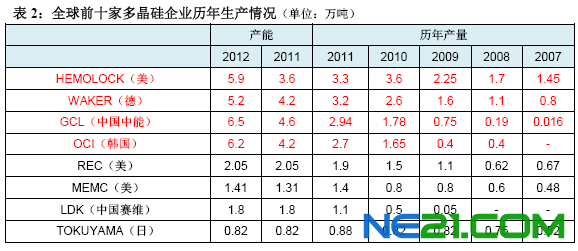 同时,从企业的产能、产量的数据来看:2012年年底,中国江苏中能和韩国OCI公司产能将分别达到6.5万吨和6.2万吨,成为全球最大的两家多晶硅生产企业,超过德国瓦克公司和美国哈姆洛克公司扩产后5.2万吨和5.9万吨的产能。届时,前四家企业的产能将达到23.8万吨,占全球总产能的57.8%,而产量将达到20万吨左右,占总产量的80%以上。同时,中国多晶硅产能的快速增长也正在影响着全球多晶硅产业。截止2011年底,中国多晶硅产能达到13.4万吨/年,产量达到8万吨,分别占全球总量的40%和33%。并且2011年全球前十大多晶硅企业中有四家中国企业。