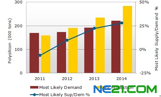 根据NPD Solarbuzz 2012年第三季度多晶硅及硅片供应链季度报告,尽管很多领先的多晶硅生产商已经在亏本经营,预计全球多晶硅总产能在2012年和2013年仍将分别增长22%和18%。2012年光伏用多晶硅的平均价格预计将比2011年下降52%,而工厂利用率将从2011年的77%下降至63%。