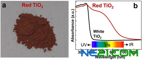 图a:红色TiO2的照片;图b:红色和白色TiO2的紫外-可见吸收光谱