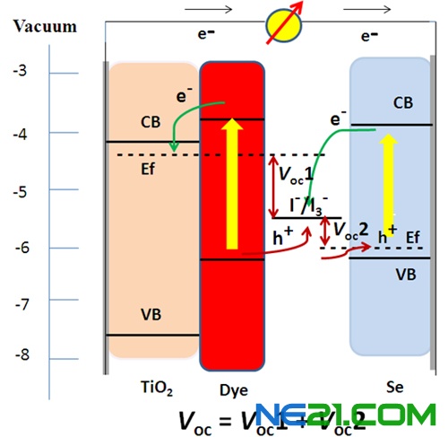 图2 双活性染料敏化光阳极和半导体硒光阴极叠层电池