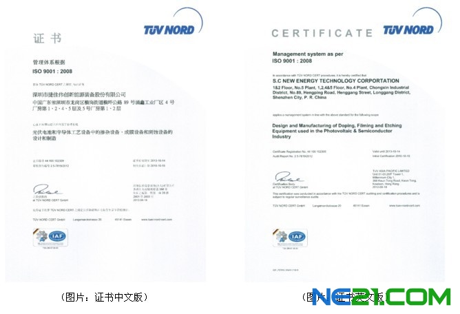 2012年8月17日,深圳市捷佳伟创新能源装备股份有限公司无条件地通过了TUV公司的ISO9001:2008质量管理体系的第二次现场监督审核。