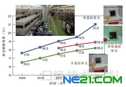 而且,业界还出现了围绕转换效率和成本的新动向,那就是新日光能源科技在2011年投产的介于传统单晶硅单元和多晶硅单元之间的“类单晶硅单元”。单晶硅单元的转换效率高,但制造成本也很高,而多晶硅单元虽然价格便宜,但转换效率太低。因此,新日光能源科技以采用类似于多晶硅单元的低成本制造方法、获得接近单晶硅单元的转换效率为目的,开发出了类单晶硅单元注1)。