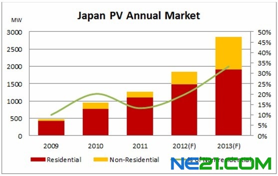 2012年对于日本光伏市场而言是一个转折点,因为非住宅市场份额从这一年开始上升。 在此之前,日本光伏市场的增长几乎完全来自住宅市场,这一点在世界主要光伏市场中间是独一无二的。 在全国上网电价的刺激下,日本市场的主要增长动力将转向被称为“兆瓦级光伏”的非住宅市场。