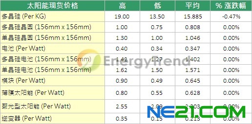 在现货市场的表现来看,由于2012年市场进入尾声,加上前景不明,目前市场交易非常清淡。根据EnergyTrend的调查,目前大陆多晶硅市场的价格出现调涨趋势,贸易商传出的消息也是逐步调涨多晶硅的报价,主因是大陆市场传出二月份将公布双反相关内容,使得大陆业者开始增加进口多晶硅的库存水位,造成价格小幅回涨;不过在其它地区的多晶硅报价仍然下跌,使得本周多晶硅报价仍然以下滑做收,目前平均价格来到$15.885/kg,跌幅0.47%,而其它产品的报价仍与上周相同。