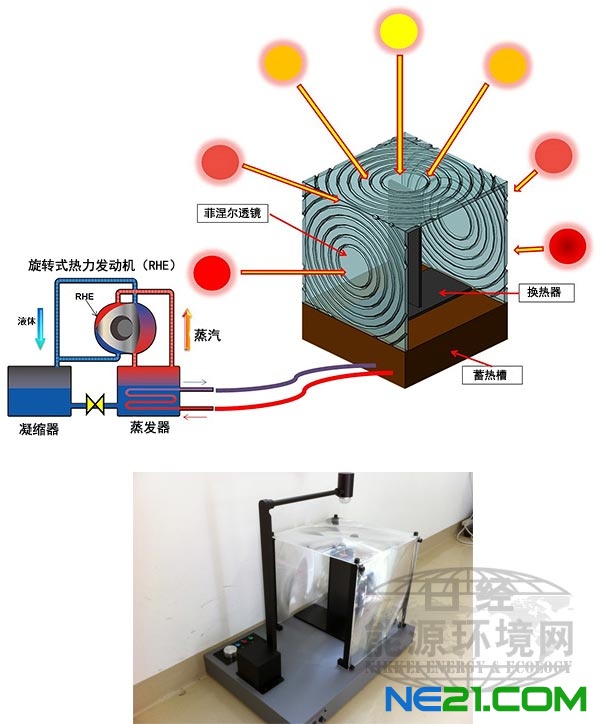 立方体内部配置有铝合金制造的用于接收菲涅尔透镜所聚集的光的倒T字型换热器,无论太阳光是从侧面还是从上面照射,均可高效提取热能。换热器下方是装满水的蓄热槽,在此生成的温水将供应给达芬奇公司开发的“旋转式热力发动机”进行发电。旋转式热力发动机通过将作为热介质的氟利昂替代物转换为气体来驱动发动机运转。该发动机是利用气缸容积的变化生成旋转能,因此即使在低温热源生成的低压力下,热工作效率也十分出色。具体来说,即使40℃左右的温度也可驱动。