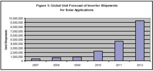 2012年全球用于太阳能系统的逆变器出货量将从2008年时的723,329个增长到950万个。图1所示为iSuppli公司对于太阳能应用市场逆变器出货量的预测。