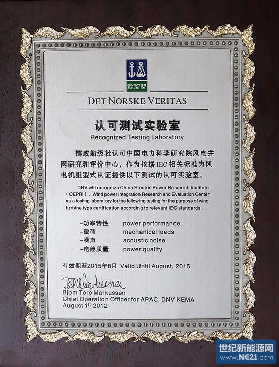 挪威船级社认可中国电科院风电并网研究和评价中心,作为依据IEC相关标准为风电机组型式认证提供功率特性、载荷、噪声和电能质量测试的认可实验室;并对中国电科院风电检测技术水平给予充分肯定,表示将以此为契机,积极推动双方依托自身技术优势在可再生能源发电和输配电的咨询、测试、检验和认证服务等方面开展交流与合作。