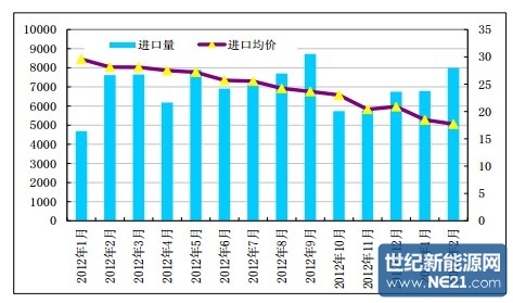 图 1 2012 年和 2013 年多晶硅进口量及进口均价示意图 数据来源:海关