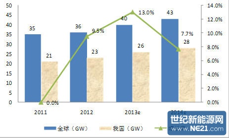 图3 2011-2014年我国光伏新增装机量、增长率及全球新增装机量