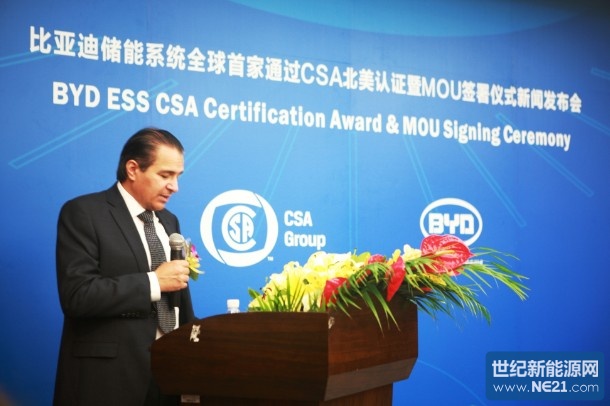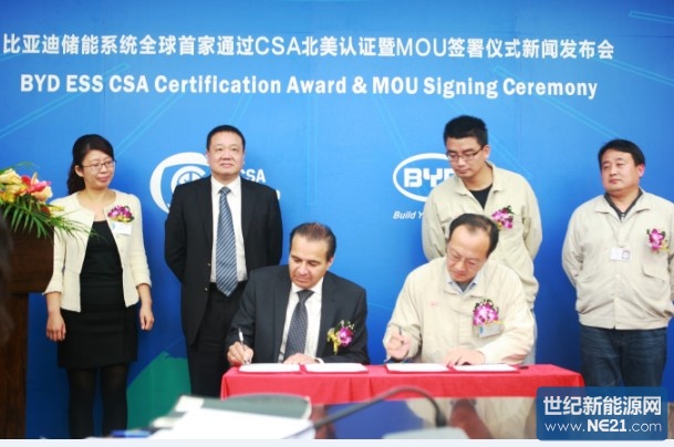 中国深圳,2014年3月11日—全球领先的测试认证和标准发展机构CSA集团今日宣布,比亚迪股份有限公司储能系统获得全球首个CSA认证。此外,双方还于今日举行了签约仪式,宣布拓宽目前的合作领域。CSA集团今日颁发的认证将有利于推动比亚迪新能源储能产品进一步打开全球市场,尤其是北美市场。
