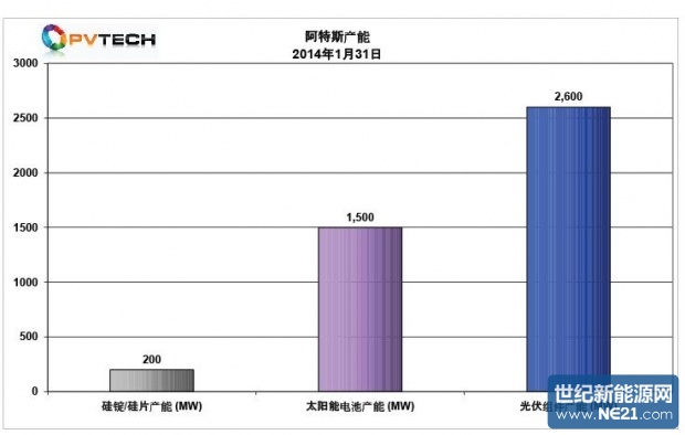 阿特斯太阳能已经将其在加拿大安大略省的组件工厂产能由2013年末的330MW提高至了2014年1月31日的530MW。目前,该公司位于中国和加拿大的各组件加工厂总额定产能为2.6GW,该数字在2013年仅为2.4GW。