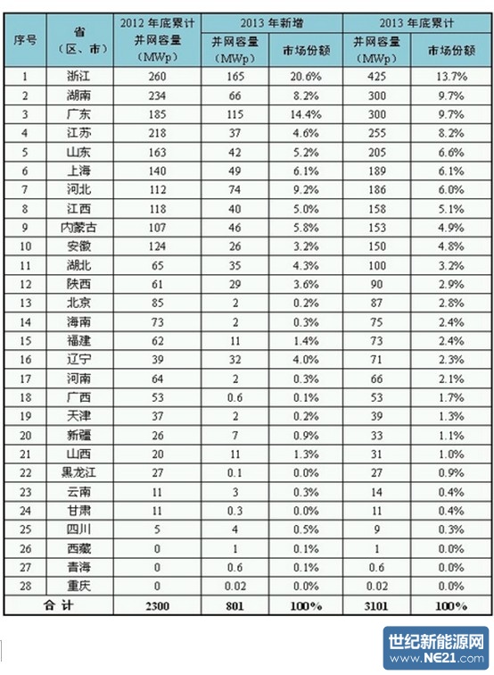 发电统计数据。其中分布式光伏电站项目主要分布在电力负荷比较集中的中东部地区,华东和华北地区累计并网容量分别为145万和49万千瓦,占全国分布式光伏的60%。排名前三的省份分别为浙江、广东和河北省,并网容量分别达到16万千瓦、11万千瓦和7万千瓦,三省之和占全国分布式光伏并网总容量的40%以上。