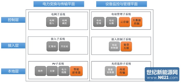 下图是智能光伏电站的整体架构图,橙色部分是光伏电站智能化改造的重点。