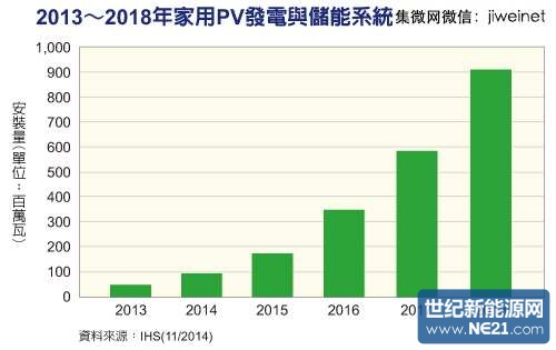 市场需求回温,市场研究机构IHS预估,全球家用太阳能(Photovoltaic, PV)发电与储能系统安装量,可望由2014年仅90百万瓦(MW)攀升至2015年约170MW,并于2018年达到超过900MW的规模。