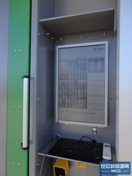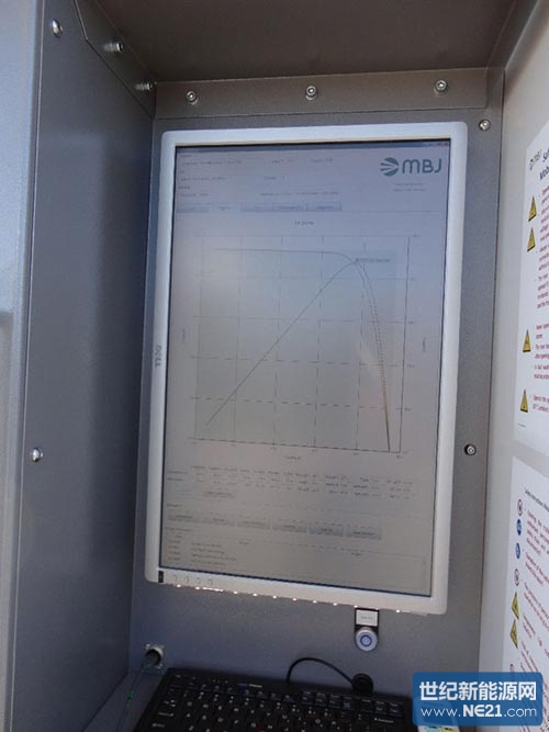 检测具体步骤如下:(1)从架台上拆下疑似异常的太阳能电池板(图5);(2)将电池板固定在从PV测试车检查装置上拖出的框架上,把背面的布线与电源连接(图6,7);(3)读取电池板的ID序号的条码,调出个人电脑中保存的出货时的性能数据;(4)把固定好电池板的框架推入检查装置中;(5)实施IV曲线检测和EL检查。结果可以当场在配备的个人电脑的屏幕上查看(图8,9)。据称4人1天可检测40~50块电池板。当简单检测难以作出判断时,还可把电池板带回检查所做精密检查。