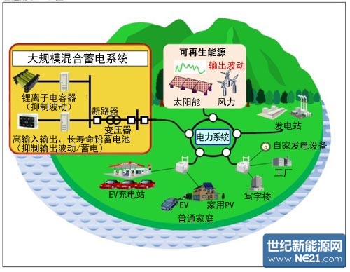 日立与新神户电机从2011年开始,就一直在日本新能源产业技术综合开发机构(NEDO)的补助事业“安全、低成本大规模混合型蓄电系统技术开发”中,验证“大规模混合蓄电系统”。该系统协同控制铅蓄电池和锂离子电容器。结合使用有利错峰和削峰的“高输入输出、长寿命铅蓄电池”和可有效抑制电压和频率的短周期波动的“锂离子电容器”,来优化控制电流的输入输出。据称由此可缓和输出功率波动、充分利用剩余电力并使频率稳定。