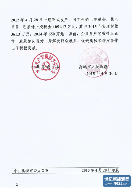 二、关于公司生产运营情况。禹城汉能公司年产1000MW薄膜太阳能电池制造基地项目,自2011年初开工建设,2012年4月28一期正式投产,同年开始上交税金,截至目前,已累计上交税金1051.17万元,其中2013年实现税收361.3万元,2014年650万元。当前,企业生产经营情况正常,发展势头良好,为解决群众就业、促进禹城经济发展作出了积极贡献。