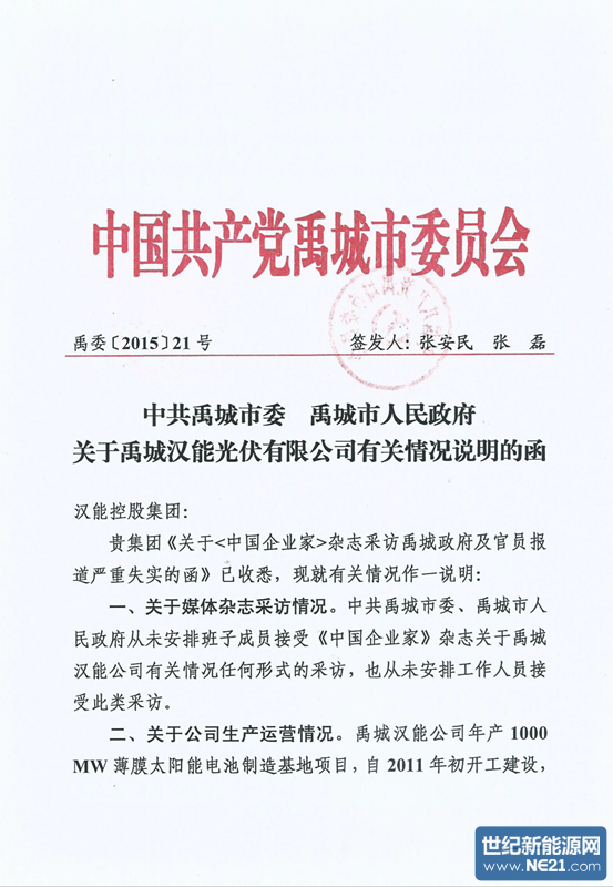 一、关于媒体杂志采访情况。中共禹城市委、禹城市人民政府从未安排班子成员接受《中国企业家》杂志关于禹城汉能公司有关情况任何形式的采访,也从未安排工作人员接受此类采访。