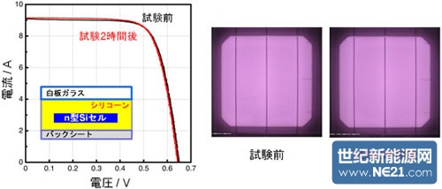 使用了新开发硅封装材料的单晶n型硅类太阳能电池板,其PID试验前后的电气特性:左;EL图像:右(出处:产业技术综合研究所)