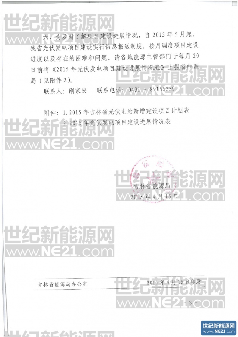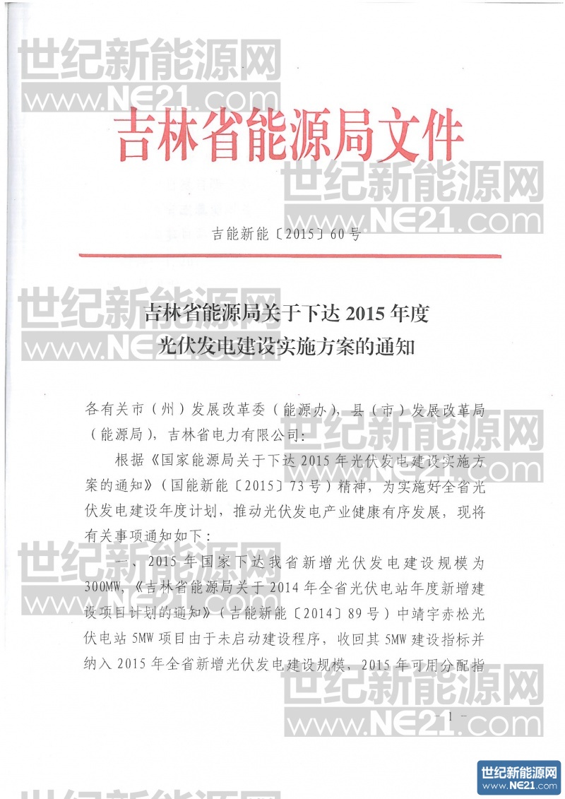 【独家】吉林省能源局关于下达2015年光伏发电建设实施方案的通知,吉能新能【2015】60号