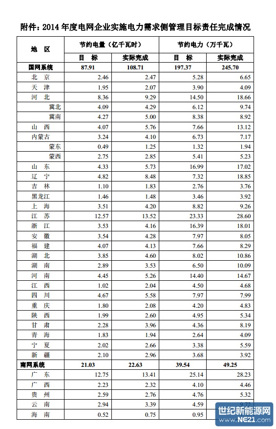 2014年,国家电网公司、南方电网公司继续深化推进电力需求侧管理工作,创新管理机制,加大资金投入力度,加强平台建设,拓展培训方式。根据各地经济运行主管部门对省级电网企业的考核结果,结合各地区之间的交叉检查,以及我委和有关部门组织的专家组对部分地区的抽查情况,综合来看,2014年国家电网公司、南方电网公司均超额完成电力需求侧管理目标任务,共节约电量131亿千瓦时,节约电力295万千瓦。除西藏外,全国30个省(区、市)的电网企业参加了考核,全部完成2014年度目标任务(详见附件)。对社会节电比重较高和考核组织管理工作较为突出的北京、河北、上海、江苏、四川、宁夏、广东、海南等省份予以通报表扬。