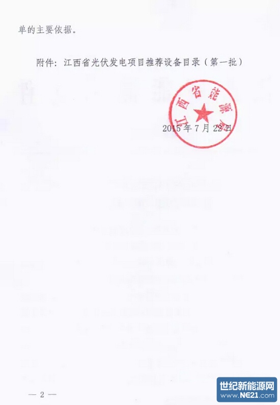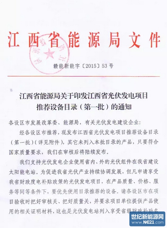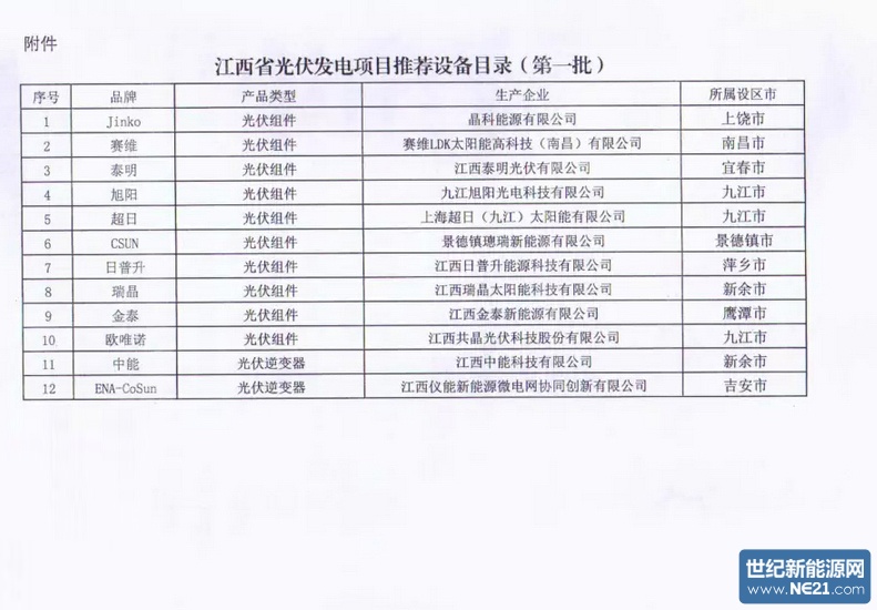 江西省光伏发电项目推荐设备目录(第一批)的通知