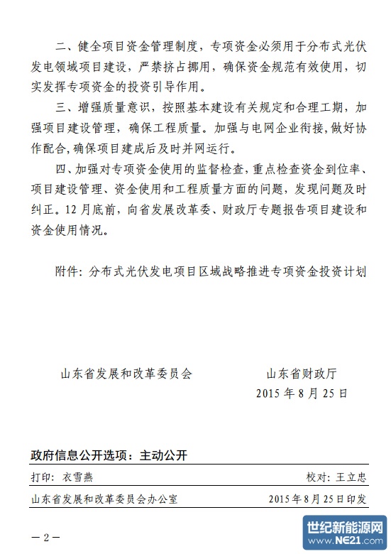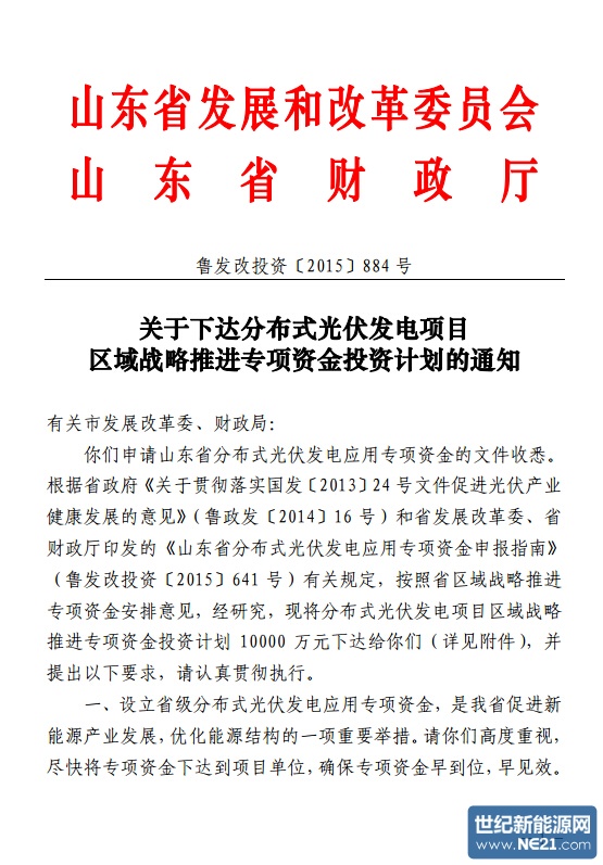 根据省政府《关于贯彻落实国发〔2013〕24 号文件促进光伏产业健康发展的意见》(鲁政发〔2014〕16 号)和省发展改革委、省财政厅印发的《山东省分布式光伏发电应用专项资金申报指南》(鲁发改投资〔2015〕641 号)有关规定,按照省区域战略推进专项资金安排意见,经研究,现将分布式光伏发电项目区域战略推进专项资金投资计划 10000 万元下达给你们(详见附件),并提出以下要求,请认真贯彻执行。