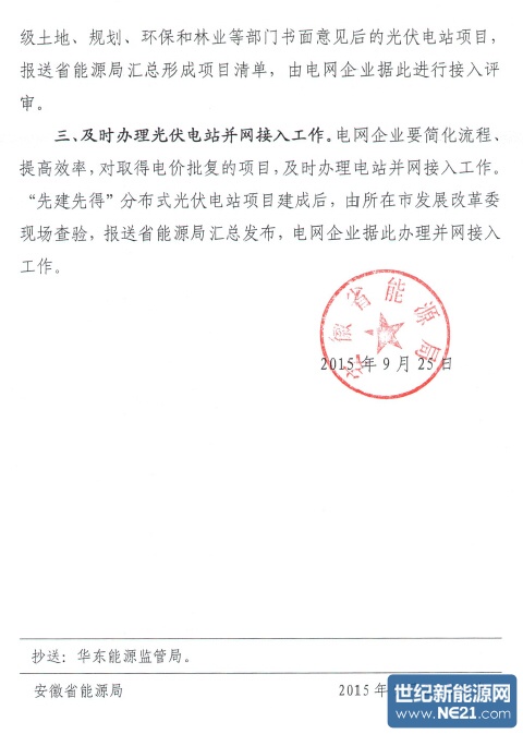三、及时办理光伏电站并网接入工作。电网企业要简化流程、提高效率,对取得电价批复的项目,及时办理电站并网接入工作。 “先建先得”分布式光伏电站项目建成后,由所在市发展改革委现场查验,报送省能源局汇总发布,电网企业据此办理并网接入工作。