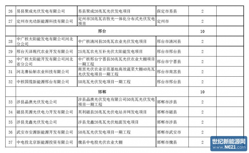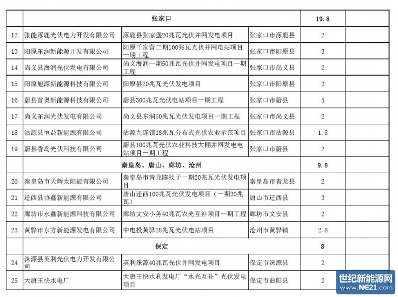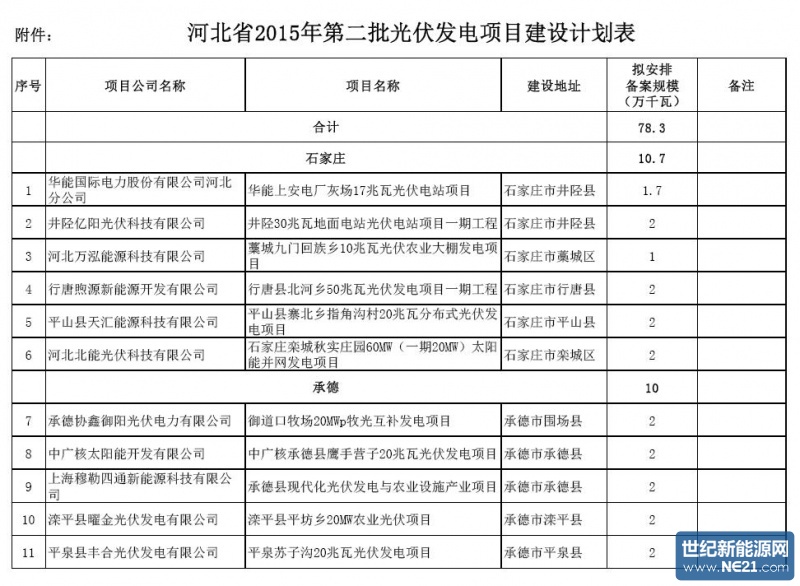 河北省2015年第二批光伏发电项目建设计划安排情况公示