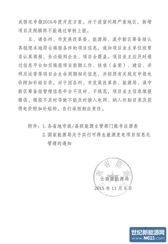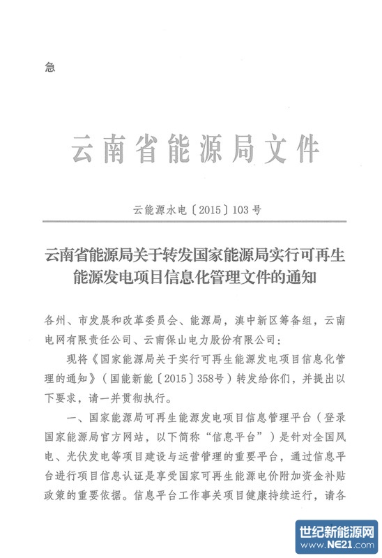 云南省能源局关于转发国家能源局实行可再生能源发电项目信息化管理文件的通知