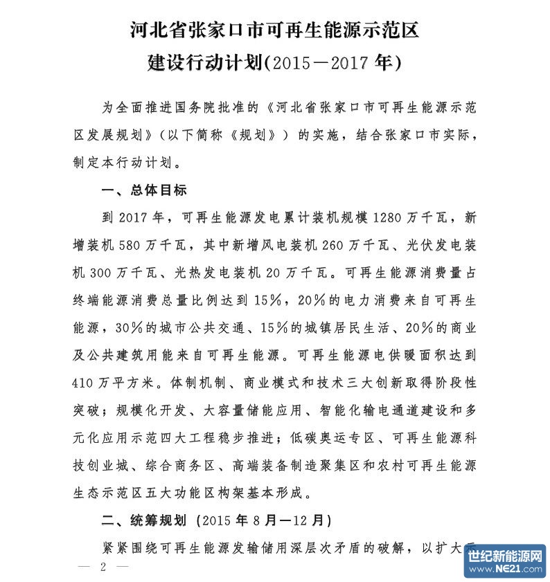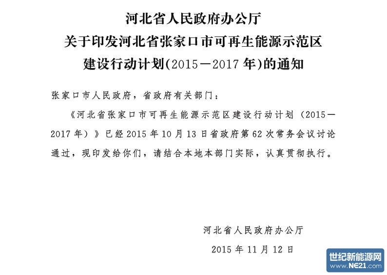 河北省人民政府办公厅关于印发河北省张家口市可再生能源示范区建设行动计划(2015-2017年)的通知