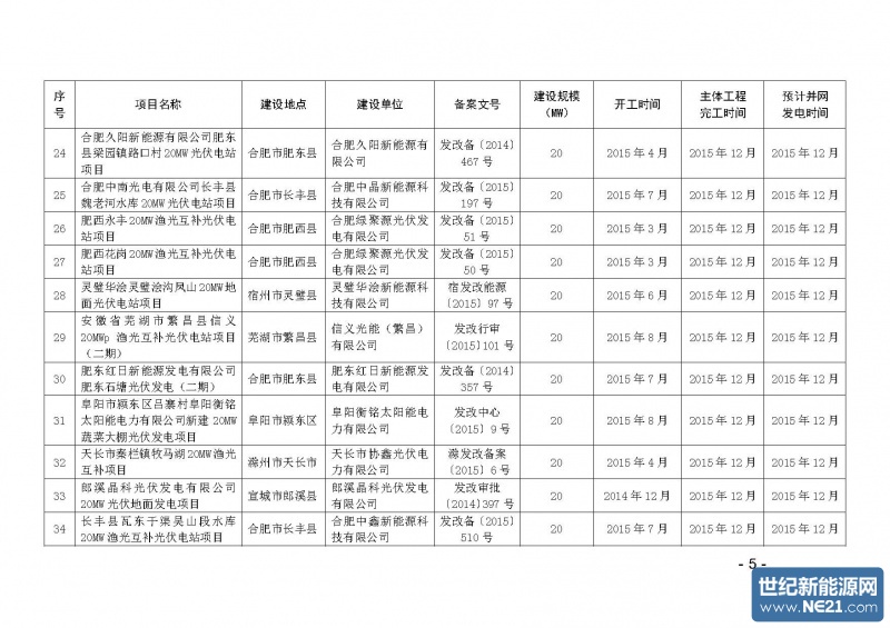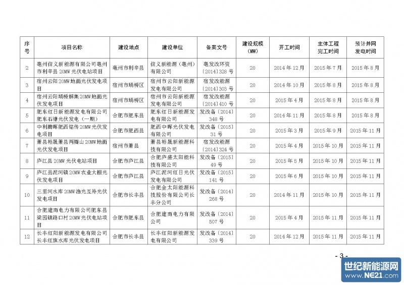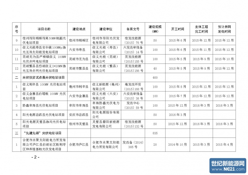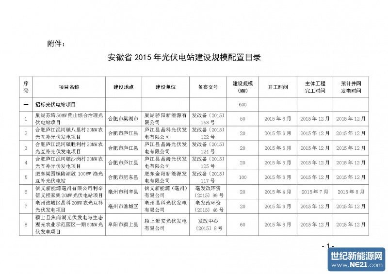 附件:安徽省2015年光伏电站建设规模配置目录