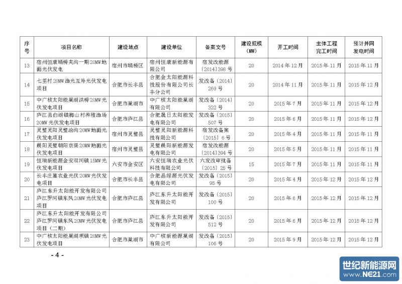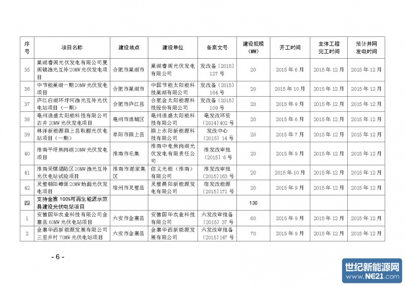 三、根据现场核查情况,将合肥永聚太阳能庐江白湖等42个光伏电站纳入先建先得项目目录,按并网先后滚动配置规模。对积极履行社会责任的项目建设单位,优先安排建设规模。本次“先建先得”项目所需规模在2014年结转和2015年追加规模中配置,不足部分从2016年规模中优先解决。